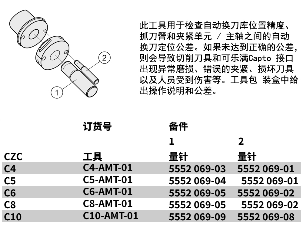 PSC校準(zhǔn)工具 此工具用于檢查自動(dòng)換刀庫位置精度、 抓刀臂和夾緊單元 / 主軸之間的自動(dòng)換刀定位公差。如果未達(dá)到正確的公差,則會(huì)導(dǎo)致切削刀具和可樂滿 Capto 接口出現(xiàn)異常磨損、錯(cuò)誤的夾緊、損壞刀具以及人員受到傷害等。工具包 裝盒中給出操作說明和公差。C4-AMT-01 C5-AMT-01 C6-AMT-01 C8-AMT-01 C10-AMT-01 5552 069-03 5552 069-04 5552 069-05 5552 069-09 5552 069-01 5552 069-02 5552 069-08