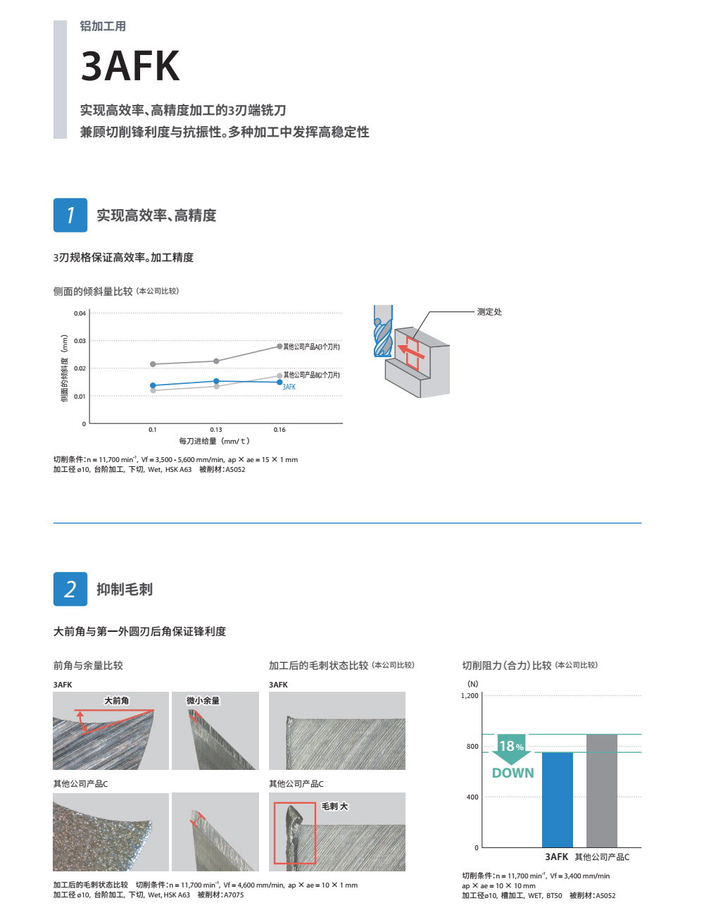 3AFK030-045-090直徑3mm刃長4.5mm頸部以下長度9mm總長70mm 端銑刀 3刃規(guī)格保證高效率。優(yōu)良的加工精度;抑制毛刺大前角與第一外圓刃后角保證優(yōu)良的鋒利度;大芯厚,高抗振刀性能;刃長2.5D(中號型)系列化,縱切深大時也能實現(xiàn)穩(wěn)定加工。
