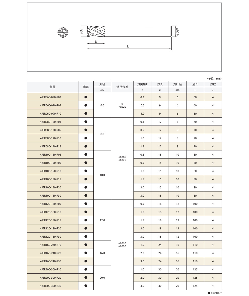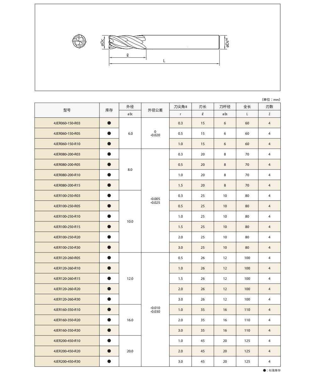 4刃圓弧立銑刀4JER080-120-R03直徑8mm刀尖圓弧R0.3mm刃長(zhǎng)12mm柄徑8mm總長(zhǎng)70mm