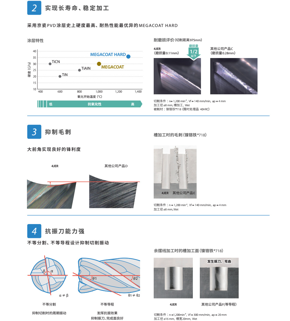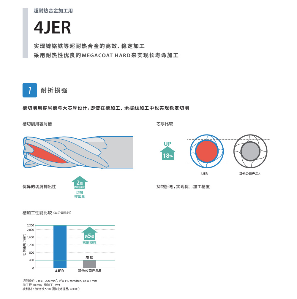 4JER超耐熱合金加工用圓弧立銑刀 實(shí)現(xiàn)鎳鉻鐵等超耐熱合金的高效、穩(wěn)定加工。 采用耐熱性強(qiáng)的MEGACOAT HARD,實(shí)現(xiàn)長(zhǎng)壽命加工。 產(chǎn)品特點(diǎn) 槽切削用容量槽與大芯厚設(shè)計(jì),耐折損強(qiáng) 采用耐熱性能優(yōu)良的MEGACOAT HARD,實(shí)現(xiàn)長(zhǎng)壽命、穩(wěn)定加工 大前角實(shí)現(xiàn)良好鋒利度。抑制毛刺 不等分割、不等導(dǎo)程設(shè)計(jì)抑制切削振動(dòng),抗振刀能力強(qiáng)。