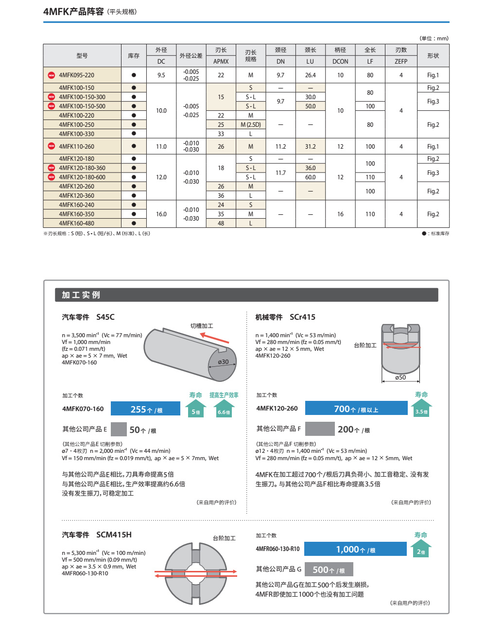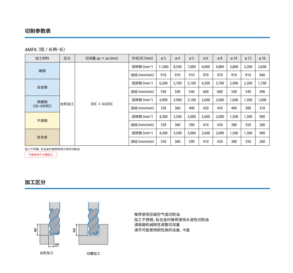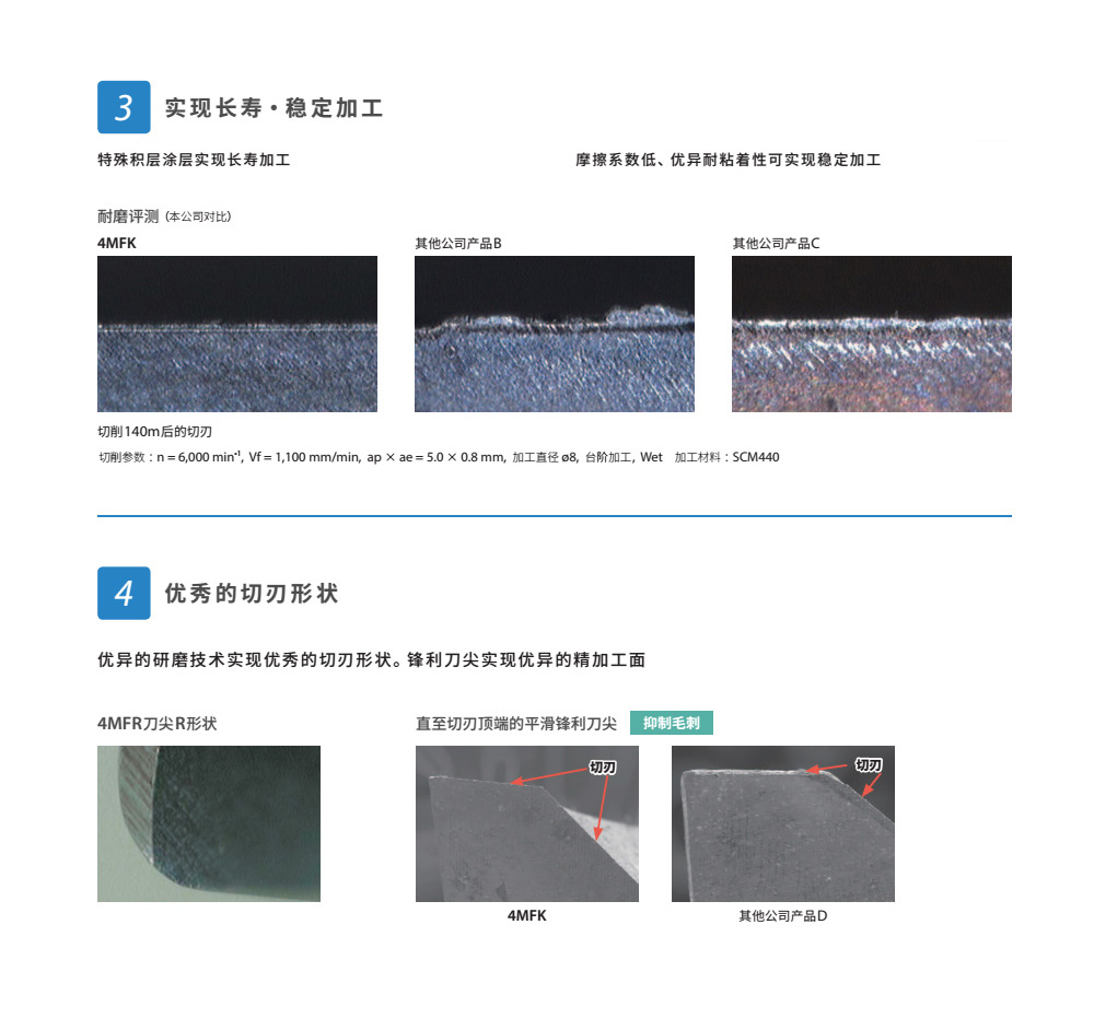 鋼件高速銑削、特殊不等分割不等導(dǎo)程設(shè)計(jì),實(shí)現(xiàn)良好抗振性能。新型特殊切削形狀實(shí)現(xiàn)穩(wěn)定切削排出性能。直角型4MFK和圓角型4MFR型