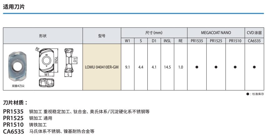 • LOMU 040410ER-GM尺寸小型刀片(雙面 4刀尖規(guī)格)??蓪?duì)應(yīng)加工大縱切深 2.5mm,可實(shí)現(xiàn)臺(tái)階 槽加工、螺旋斜降加工等的高效 3維加工。鈦合金、奧氏體系/沉淀硬化系不銹鋼