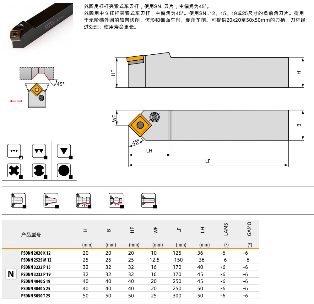 SN.. 1204.. 外圓車削刀桿 PSDNN 2525 M 12 訂貨號 6756906 杠桿夾緊式車刀桿 可夾持 正方形 負(fù)前角 刀片 內(nèi)切圓直徑為 12.7mm, 4.76mm 厚度 (ISO 標(biāo)識 SN.. 1204.. ), 左右手刀具, 45°主偏角與直柄, 25mm 刀具高度 x 25mm 寬度 x 150mm 長度用于 倒角加工, 錐面車削, 單向和多向仿形車削, 軸向車削-無方肩