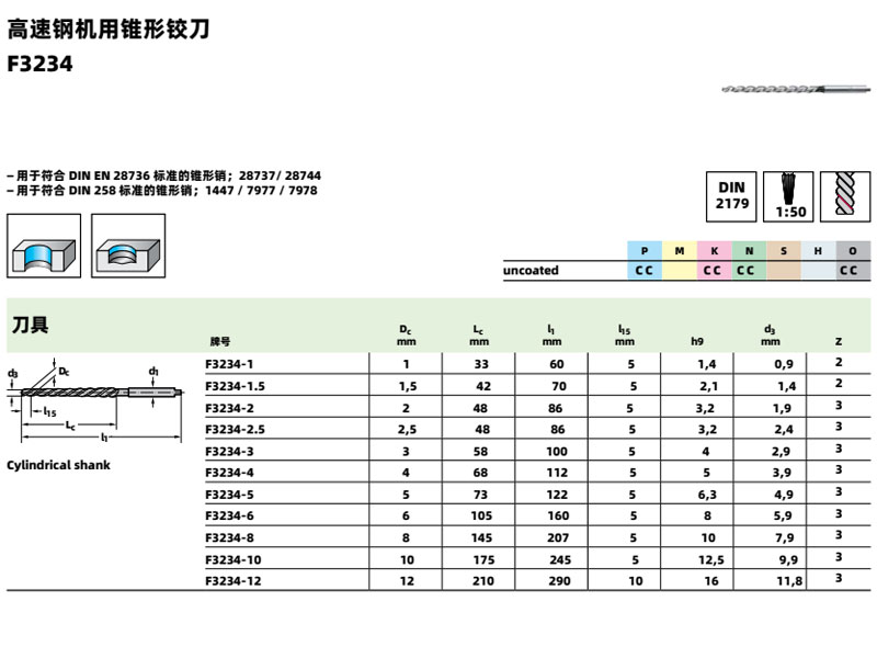 F3234高速鋼機用錐度鉸刀DIN2179錐度1:50無涂層加工鋼件、鑄鐵、鋁合金 用于符合 DIN EN 28736 標準的錐形銷;28737/ 28744,用于符合 DIN 258 標準的錐形銷;1447 / 7977 / 7978
