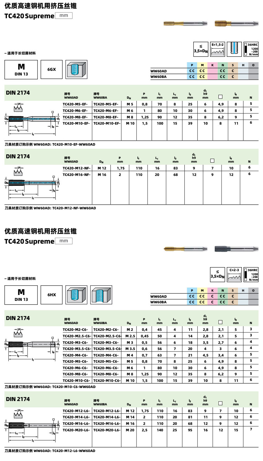 高速鋼機(jī)用擠壓絲錐 TC420 適合加工HRC36以下鋼件、不銹鋼、鋁合金、鑄鐵