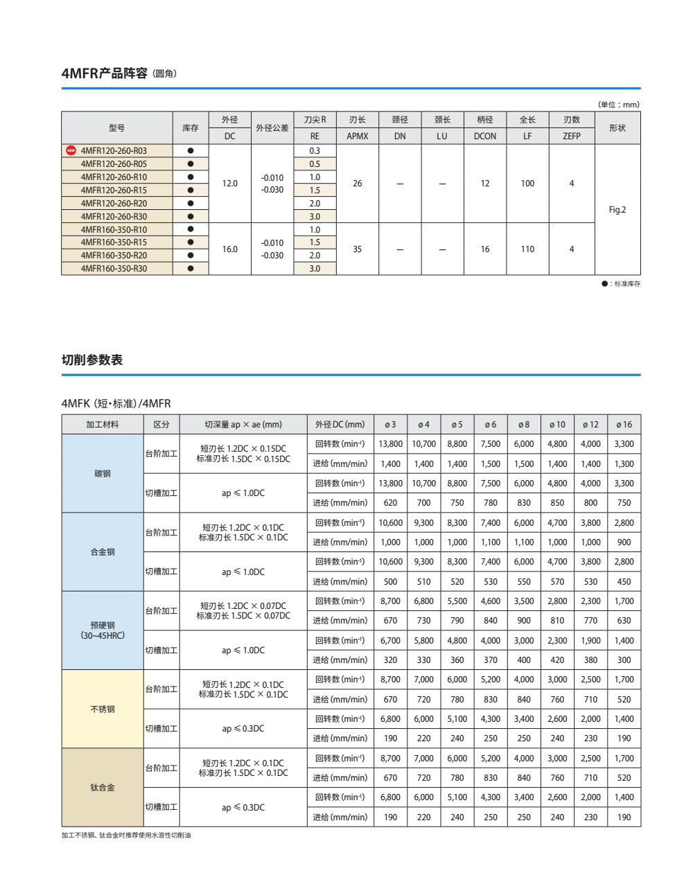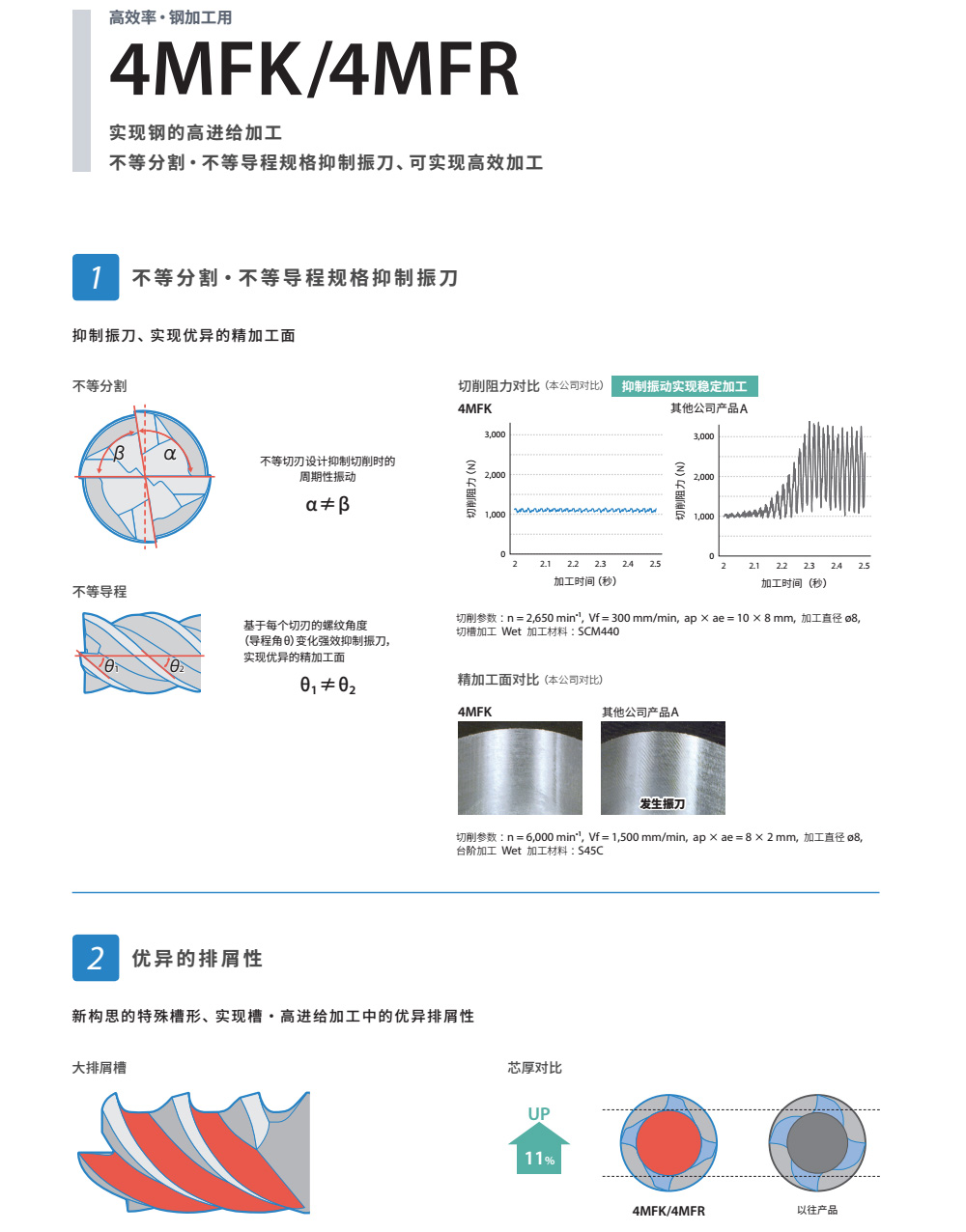 鋼件高速銑削、特殊不等分割不等導(dǎo)程設(shè)計,實現(xiàn)良好抗振性能。新型特殊切削形狀實現(xiàn)穩(wěn)定切削排出性能。直角型4MFK和圓角型4MFR型